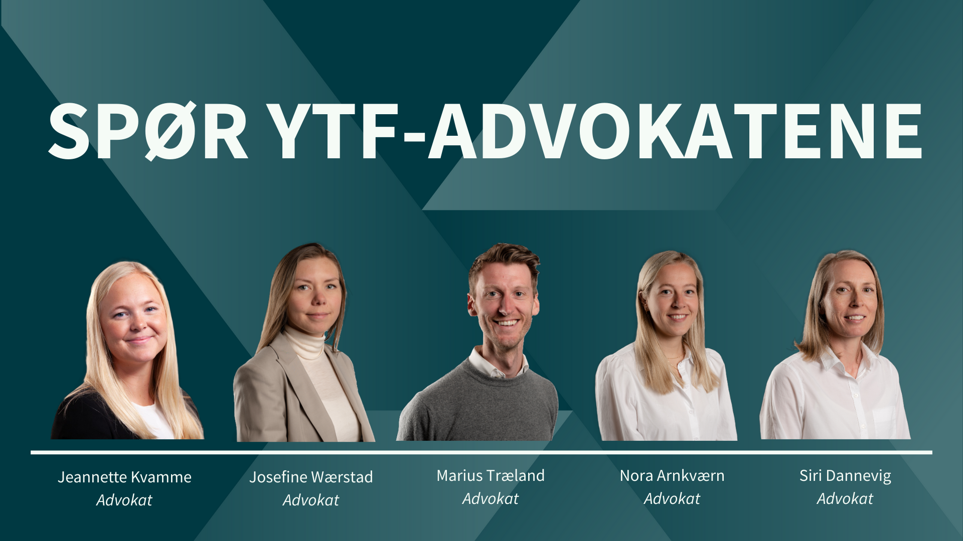 Som YTF-medlem har du rett til juridisk hjelp etter at du har vært medlem i 2 måneder. Du kan sende dine spørsmål til advokatene@ytf.no eller ringe 406 03 700.